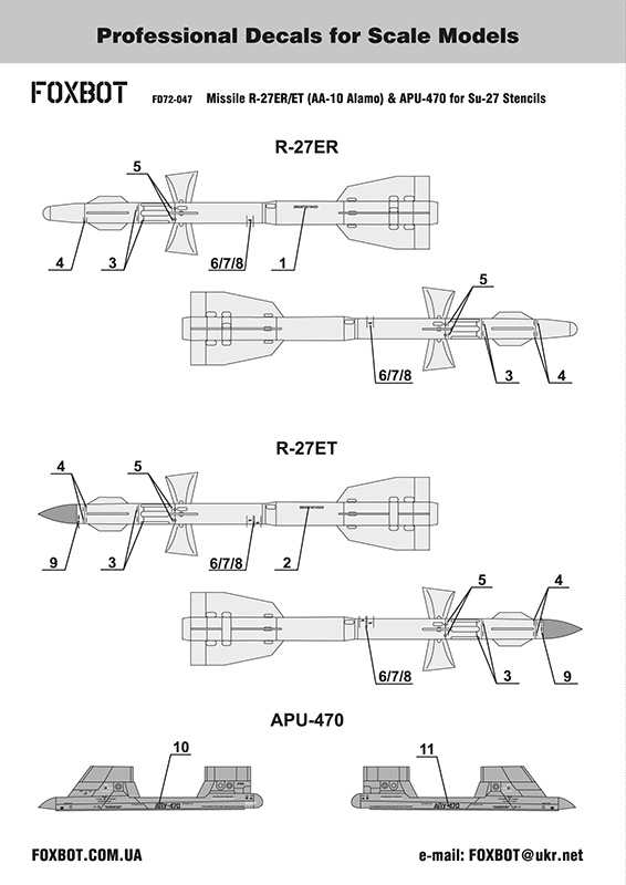 Foxbot Decals - 1/72 Soviet Missile R-27ER/ET (AA-10 Alamo) & APU-470 for Sukhoi Su-27 Stencils