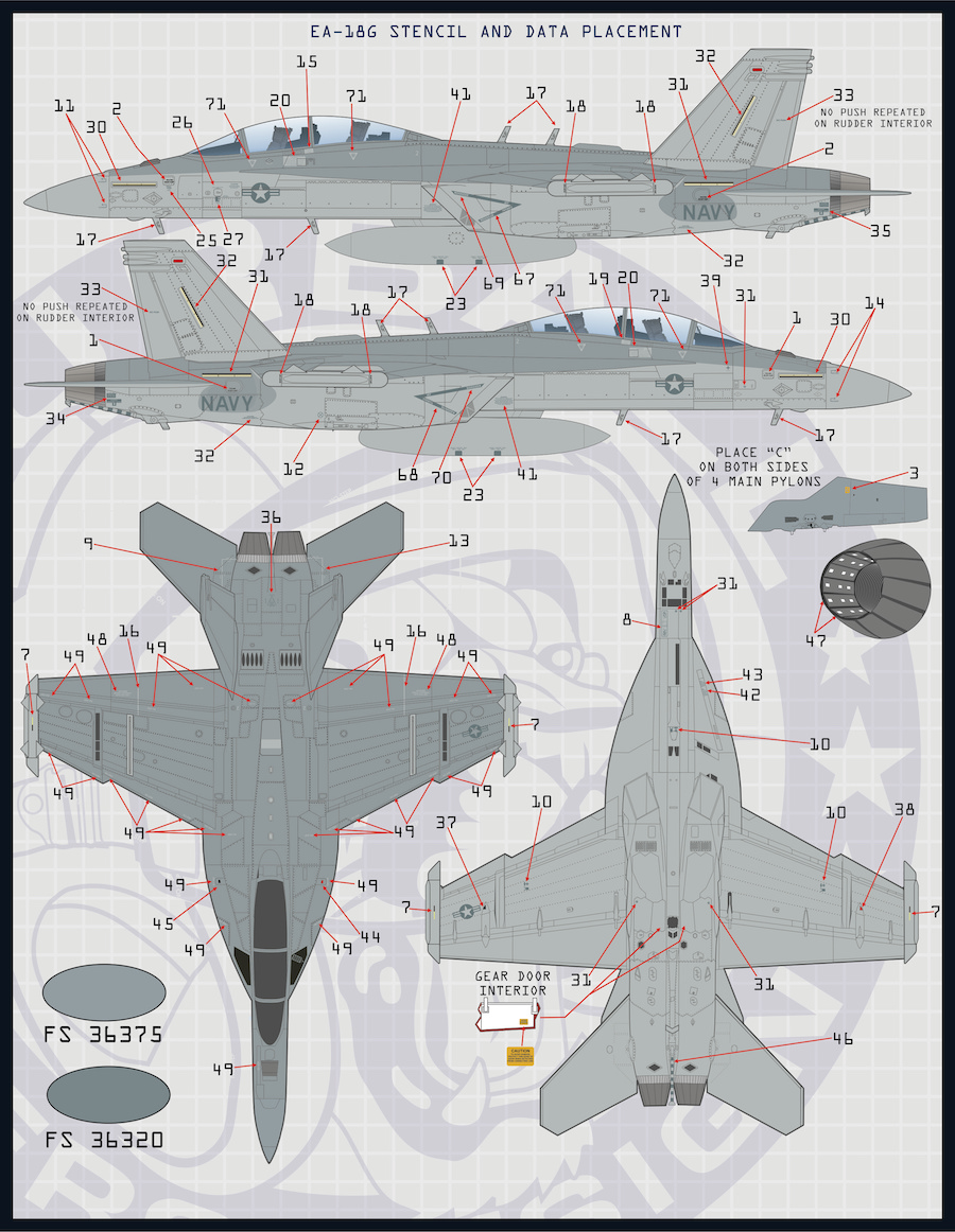 Furball Aero-Design - 1/48 Boeing F/A-18E F/A-18F F/A-18G Super Hornet Stencils and Data. This set covers all of the stencil and data markings applied to the Super Hornet and Growler. In addition to the markings applied to the airframe, ejection seat, pylon markings, and pod markings are included as well. Bureau numbers are included to reproduce any Super Hornet or Growler. Aircraft carrier names are also included. Enough decals are provided to complete 2 models.
