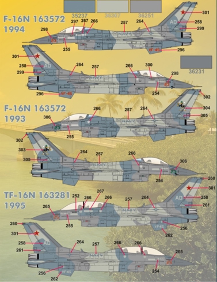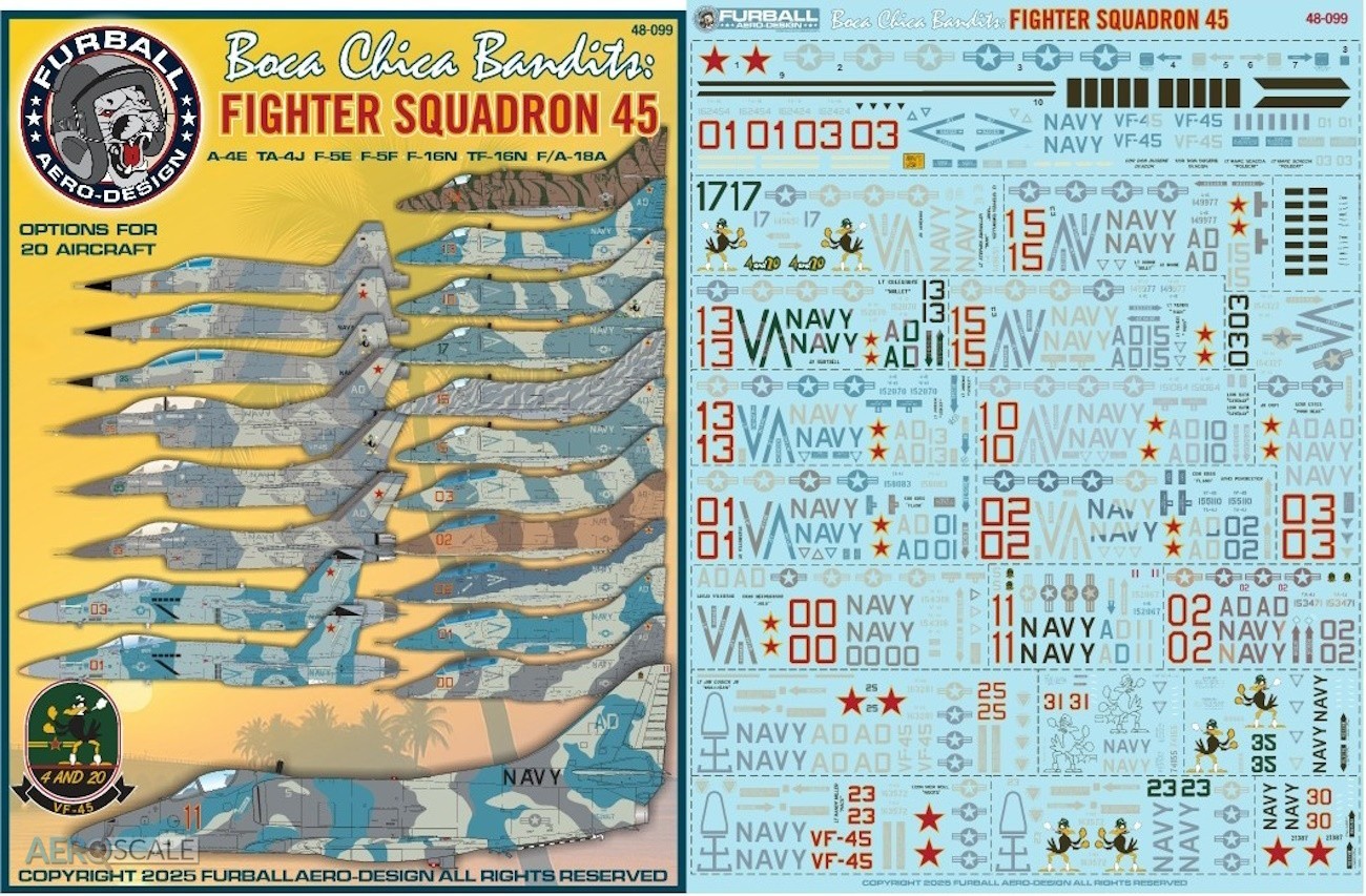 Furball Aero-Design - 1/48 'Boca Chica Bandits' features the colorful adversary aircraft of VF-45 and Nas Key West. This set has 20 options in total and allows the modeler to build 7 A-4Es, 5 TA-4Js, 2 F-5Es, 1 F-5F, 2 F/A-18As, 2 F-16Ns, and 1 TF-16N. Here's a rundown of the specific aircraft included:TA-4J 153471, Nas Key West, 1987 AD-02 two-tone brown schemeTA-4J 155110, Nas Key West, 1989 AD-02 two-tone gray schemeTA-4J 154318, Nas Key West, 1990 AD-00 two-tone gray schemeTA-4J 158083, Nas Key West, 1990 AD-01 two-tone blue/gray schemeTA-4J 154327, Nas Key West, 1988 AD-03 two-tone gray schemeF-5E 721387, Nas Key West, 1990 AD-30 three-tone gray 'Aegean Scheme'F-5E 741554, Nas Key West, 1993 AD-31 three-tone gray 'Aegean Scheme'F-5F 160966, Nas Key West, 1993 AD-35 three-tone gray 'Aegean Scheme'F/A-18A 162424, Nas Key West, 1995 AD-01 two-tone blue schemeF/A-18A 162454, Nas Key West, 1995 AD-03 two-tone blue schemeF-16N 163572, Nas Key West, 1994 AD-23 three-tone gray 'Aegean Scheme'F-16N 163572, Nas Key West, 1993 AD-23 three-tone gray 'Aegean Scheme'TF-16N 163281, Nas Key West, 1995 AD-25 three-tone gray 'Aegean Scheme'A-4E 152070, Nas Key West, 1989 AD-13 two-tone blue schemeA-4E 152070, Nas Key West, 1987 AD-13 Green/Brown tiger striped schemeA-4E 152067, Nas Key West, 1985 AD-11 3 tone Blue/Gray tropical schemeA-4E 151064, Nas Key West, 1988 AD-10 two-tone blue/gray schemeA-4E 149651, Nas Key West, 1993 AD-17 two-tone blue/gray schemeA-4E 149977, Nas Key West, 1987 AD-15 two-tone gray tiger striped schemeA-4E 149977, Nas Key West, 1988, AD-15 two-tone blue/gray scheme