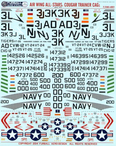 Furball Aero-Design - 1/48 Air Wing All Stars Cougar Trainer CAG features markings for nine Grumman F9F-8T/TF-9J Cougar aircraft all in 1/48 scale. Enough stencils and data are included to build two complete models. Here's a rundown on the aircraft covered: -VT-24, TF-9J 147371 3K 400, NAS Chase Field, 1968 -VT-24, F9F-8T 142526 3K 200, NAS Chase Field, 1961 -VT-25, TF-9J 147414 3J 500, NAS Chase Field, 1968 -VT-25, TF-9J 146395 3L 000, NAS Chase Field, 1967 -VT-26, TF-9J 147299 3L 600, NAS Chase Field, 1968 -VT-26, TF-9J 147274 3L 600, NAS Chase Field, 1969 -CVW-12, TF-9J 147312 NJ 00, NAS Miramar, 1964 -CVG-12, F9F-8T 147372 NJ 00, NAS Miramar, 1960 -VA-45, TF-9J 147339 AD 600, NAS Cecil Field, 1967 [Grumman TF-9J Cougar (F9F-8T) (designed to be used with Kitty Hawk Model kits)]