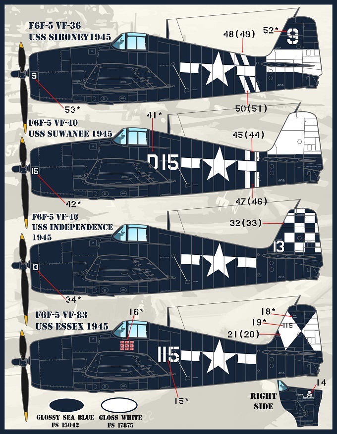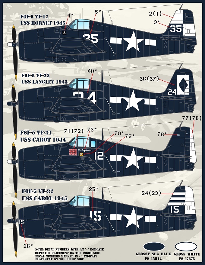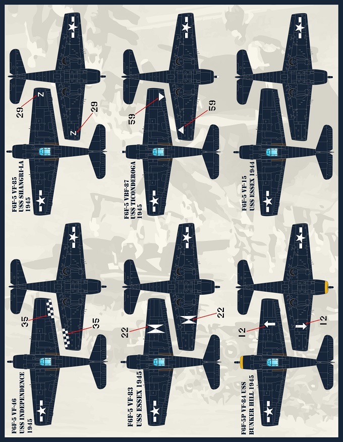 This set options for 12 F6F-5 Hellcats in the Glossy Sea Blue scheme: It is sized for the Eduard kits.