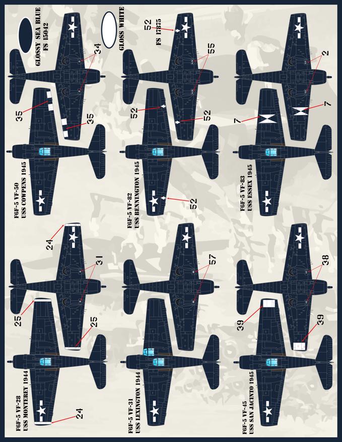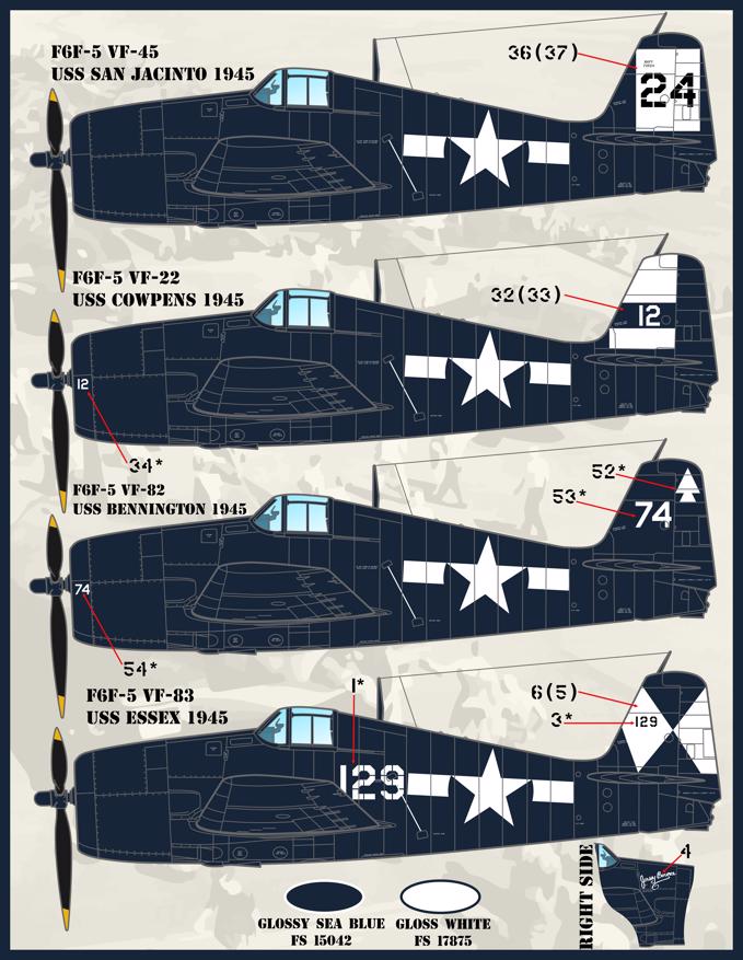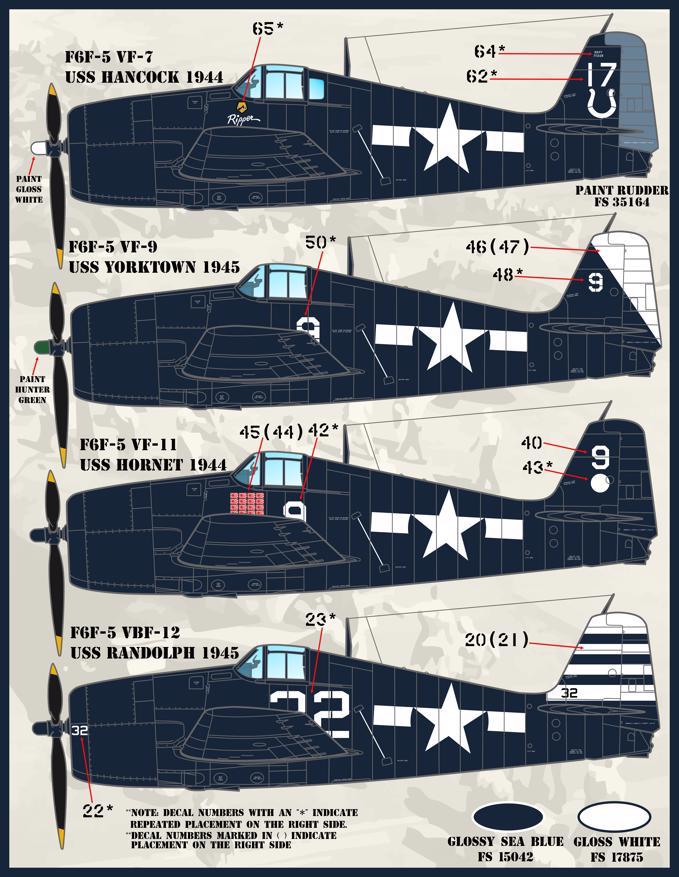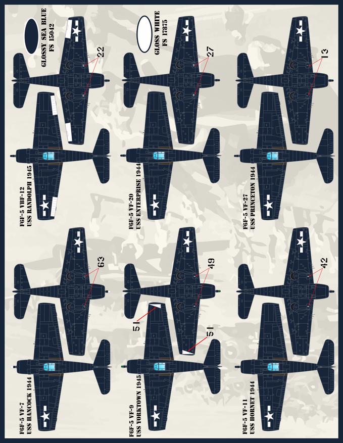 Furball Aero-Design - 1/72 Grumman Hellcat. sized for the Eduard kits. 'Colors and Markings of US Navy F6F Hellcats Part 2'. This set options for 12 F6F-5 Hellcats in the Glossy Sea Blue scheme: