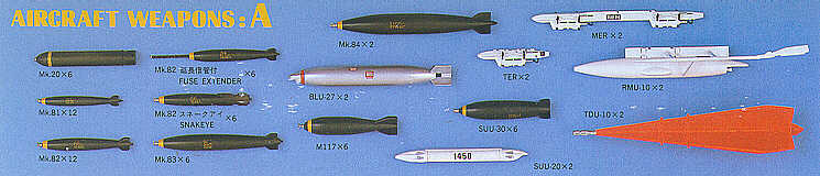 Hasegawa - 1/48 Aircraft weapons A. Mk.81, Mk.82, Mk.82 with fuse extender, Mk.82 Snakeye, Mk.83 bomb, Mk.84 and M117 bombs, BLU-27 Napalm, SUU-30 dispenser, Mk.20 Rockeye, SUU-20 dispenser, MER Multiple and Triple Ejector Rack, A/A37U Tow Target System, TDU-10B target