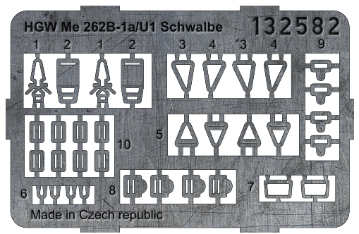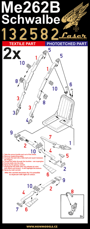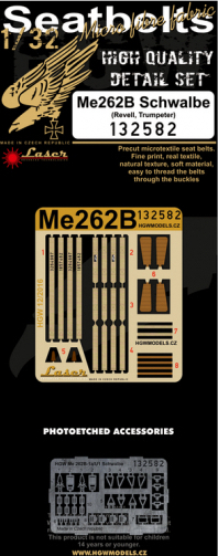 HGW - 1/32 Messerschmitt Me-262B Schwalbe pre-cut (laser) (for Revell and Trumpeter kits) Accessory designed for your plastic model Me 262B Schwalbe from Revell or Trumpeter. Seat belts from HGW Models are laser-cut so it is easy-to-use product. Set contains micro fabric belts and photo etched buckles suitable for large scale planes in 1/32 scale.