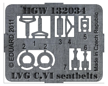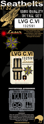 HGW - 1/32 LVG C.VI pre-cut (laser) seatbelt (for Wingnut Wings kits) Accessory designed for the LVG C.VI by Wingnut Wings. Seat belts from HGW Models are laser-cut so it is easy-to-use product. Belts are made from real textile and are suitable for large scale models in 1/32 scale.