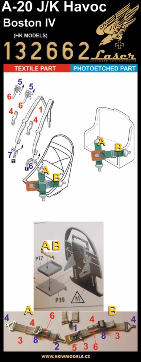 HGW - 1/32 Douglas A-20J/K Havoc / Boston Mk.IV Seatbelts Textile seat belts designed for aircraft A20 J/K Havoc (Boston IV). Belts are made from real microfibre and in combination with included photo etched buckles they look highly realistic. (for Hong Kong)
