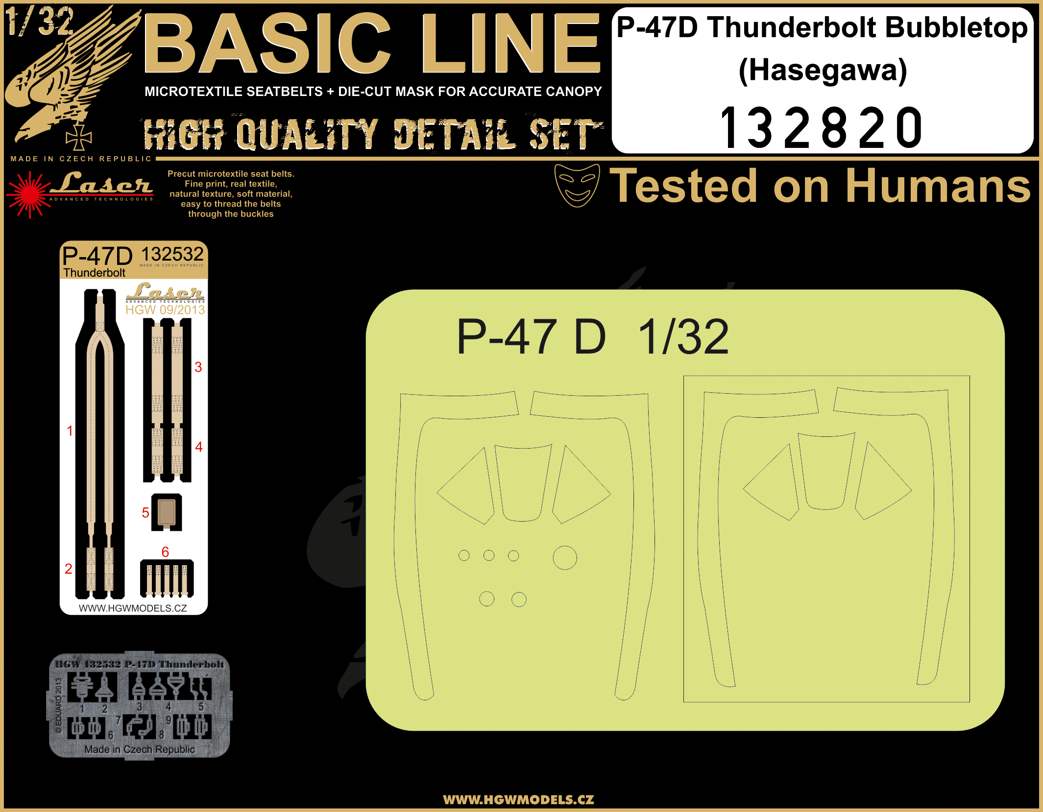 HGW - 1/32 Republic P-47D Thunderbolt Bubbletop BASIC LINE: laser cut seatbelts, etched buckles + canopy masks (for Hasegawa kits)