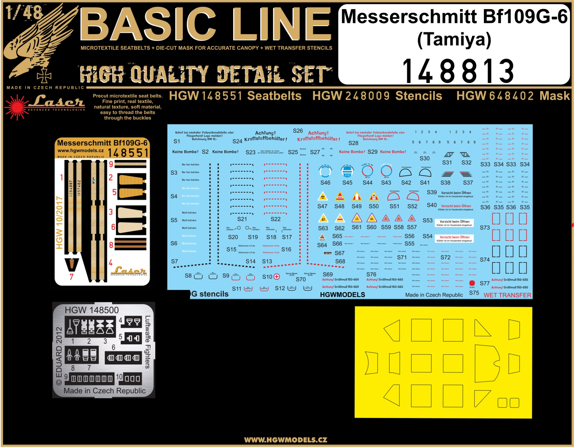 HGW - 1/48 Messerschmitt Bf-109G-6 Basic LINE: micro textile seatbelts with etched buckles + canopy paint masks and stencil data decals (for Tamiya kits)