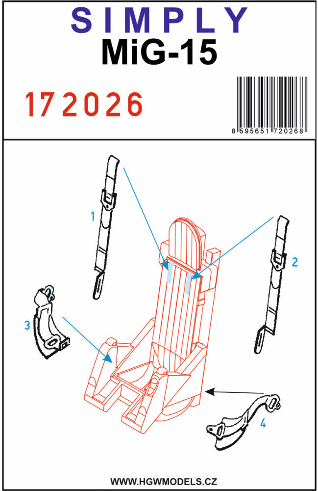 HGW - Mikoyan MIG-15 Seatbelts Brand new Hgw seatbelts in 1/72 scale. Special technology allows printing seatbelts of an appropriate scale including thickness and a transfer without the carrier film. Simply soak the seatbelts in the water, detach them from the paper, and set them on the pilot seat