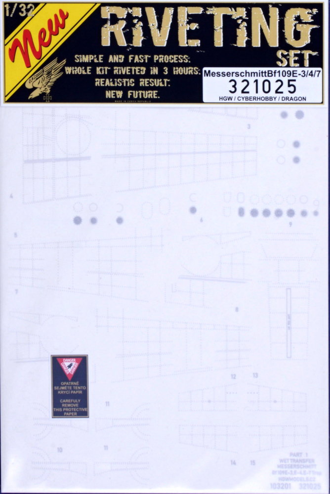 Complete pack of positive rivets for Bf109E-3/4/7 in 1/32 scale. Riveting sets from Hgw Models give to surfaces of plastic kits highly realistic look. We recommend to apply them under the paint and when your model is painted just polish the surface to make the accessory visible. Suitable for Dragon, Cyber Hobby, Hgw kits.