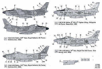 Hi Decal - 1/48 North-American F-86D Sabre International (4) 16171 337Sqn 1965 Camouflage green/tan/grey, 18305 FU-305 343 SQn 1963 natural metal. Both Royal Hellenic Air Force. 18406 FU-406 8FS 5FW Phillippine Air Force 1965, 30848 No 1222 12 Sqn Royal Thai Air Force 1069
