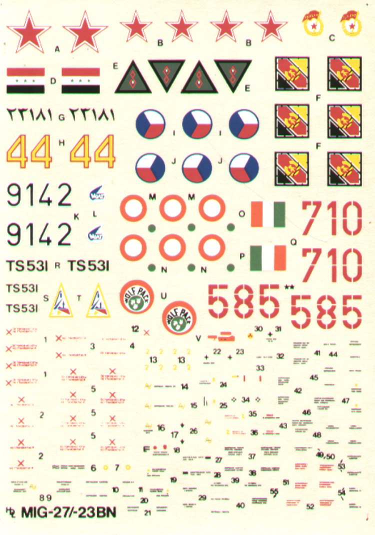 HI Decal - 1/72 Mikoyan MiG-23/27B/N Flogger B/N (5) Soviet Yellow 44 1991, Indian Air Force 9 Sqn TS531, Iraqi Air Force 1990, East German Red 7120 1989, Czech/Slovak 28 Fighter Bomber Regt 1992