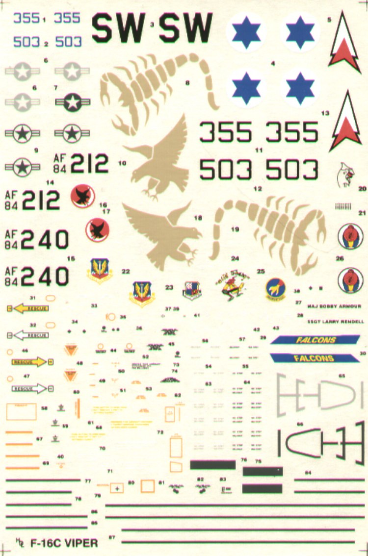 HI Decal - 1/72 Lockheed-Martin F-16C (4) 84-240 33TFS SW Shaw Air Force Base, 64-212 33TFS in experimental desert camo, Both Desert Storm, No 355 Valley Sqn, No 603 Scorpion Sqn. Both Israeli Defence Force