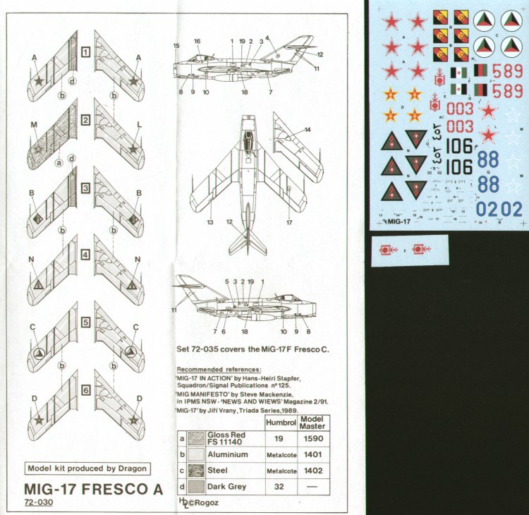 HI Decal - 1/72 Mikoyan MiG-17 Fresco A (6) USSR, Blue 88 Czech invasion 1968, Blue 02 Aerobatic Team 1956, GDR, Red 589 1960, Iraq 1961, Mongolia, Red 003 1966, Royal Afghan Air Force Black 106 1962