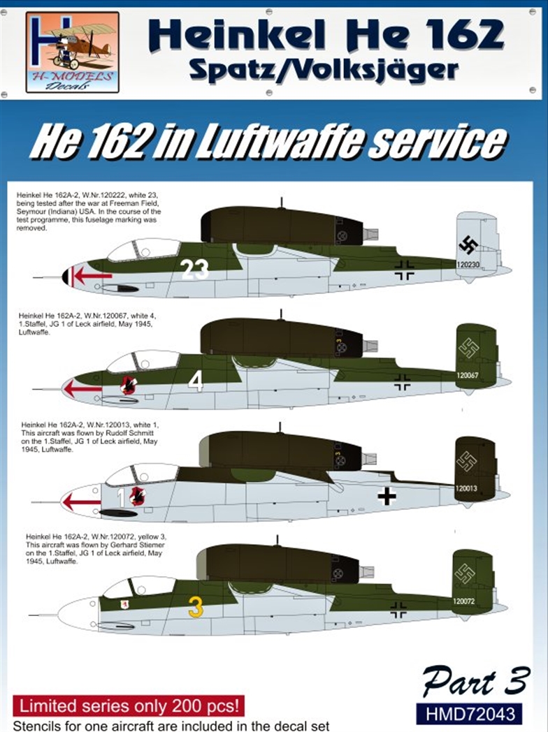 HM DECALS - 1/72 Decals He 162 in Luftwaffe Service - Part 3