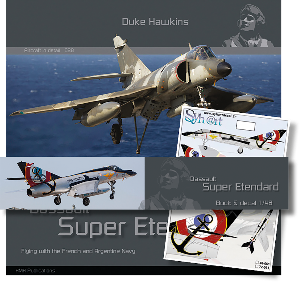HMH-Publications - Dassault Super Etendard DH-038 And the the long discontinued Syhart SY48061. Only a small quantity will be available. A 116 page book on the Dassault Super Etendard. This book shows every detail of the compact jet that was used for 4 decades by the French Navy, from cockpit to fuselage, landing gear, wings, engine exhaust and as is tradition: an extensive maintenance chapter. This book also includes a lot of action of the aircraft, both in the air and on the deck of the French aircraft carrier Charles de Gaulle.