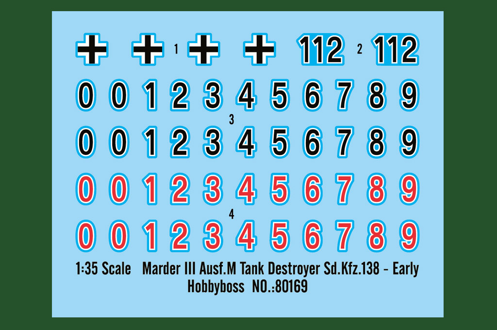 Hobby Boss - 1/35 Marder III Ausf.M Early version Sd.Kfz.138. The last Marder III variant was based on the Geschützwagen 38(t) Ausf. M, a purpose-designed vehicle for self-propelled gun use, again armed with the 75 mm PaK 40 anti-tank gun. Ausf. M was the final variant of the Marder series and was a significant improvement over previous models, with its lower silhouette, sloped armor and much more functional fighting compartment. In this variant, the engine was moved from the rear to the middle between driver and the rest of the crew. Because there was no engine in the rear, the gun and the crew did not have to sit on top of the engine deck as in previous models. The fighting compartment could be lowered down to the bottom floor level where the engine used to be, which decreased crew exposure, as well as visibility. Unlike the previous two Marder IIIs, the fighting compartment was closed at the rear, protecting the crew up to their midsection. It stayed open-topped. It could carry only 27 rounds of ammunition. The machinegun port at the front was eliminated in the Ausf. M in favor of an MG 34 or MG 42 carried by the crew.