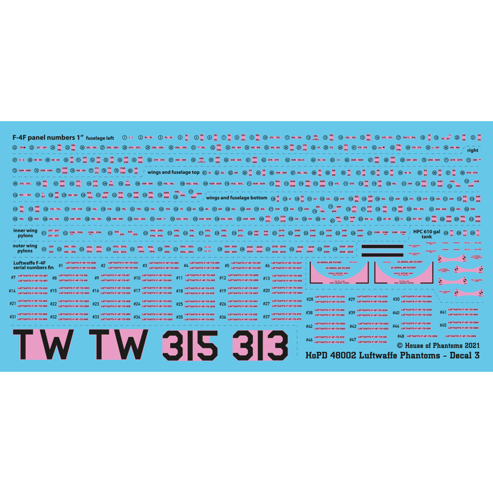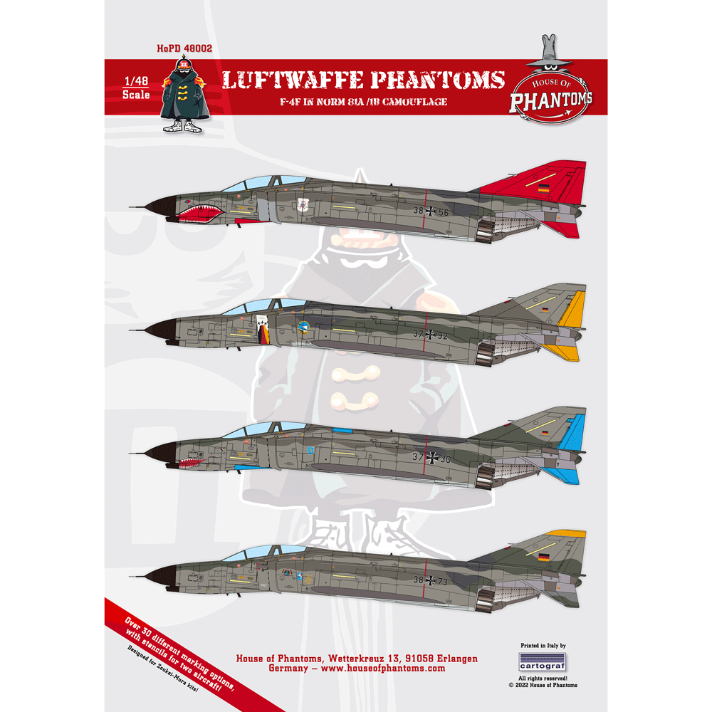 House Of Phantom Decals - 1/48 Luftwaffe Phantoms-McDonnell F-4F Phantoms in Norm 81A/B Camouflage. This sheet features over 30 marking options, including 'shark mouth' aircraft and 'TAM' exercise markings, plus stencils for two Phantoms. Decal designed for the Zoukei-Mura range of F-4 in 1/48 scale.