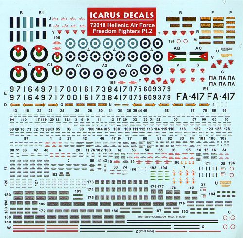 Icarus Productions - 1/72 Hellenic Air Force F-5s Pt.2: Offering national insignia and serial numbers for models of Hellenic Northrop F-5A/F-5Bs and RF-5As in "Asia Minor" (ex-Jordan a/c) and "TAC" camouflage schemes, plus aircraft in silver. Three full sets of fin flashes and four sets of roundels are included, as well as one full set of Jordanian insignia that were overpainted with Hellenic ones on several ex-Jordanian aircraft. Also included are two full sets of stencils, and serial numbers for eight different aircraft.