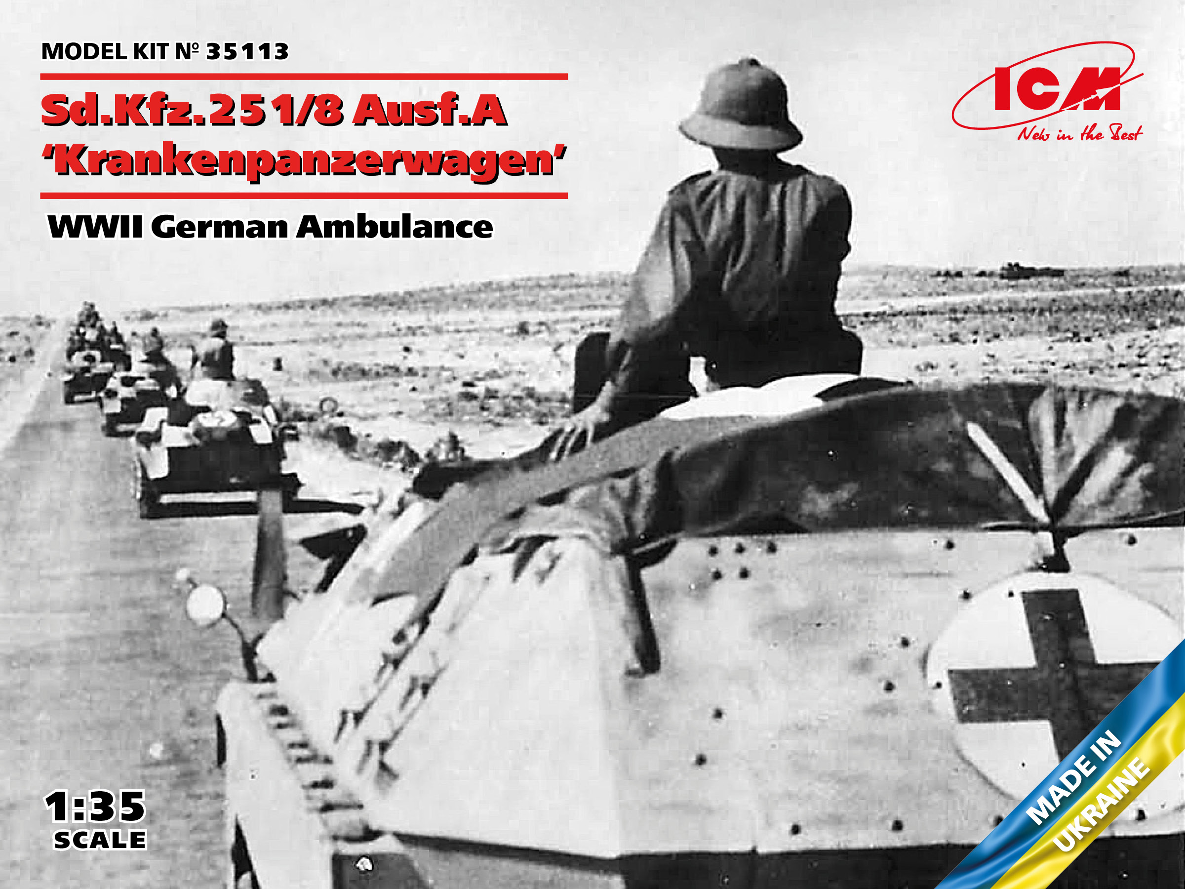 ICM - 1/35 Sd.Kfz.251/8 Ausf.A 'Krankenpanzerwagen', WWII German Ambulance. The Sd.Kfz.251 semi-tracked armoured personnel carrier was the main armoured vehicle of the Wehrmacht. It was designed by Hanomag in 1938 and mass production started the following summer. The armoured personnel carriers were in service with the German army throughout the Second World War and were used in all theatres of operations, with a total quantity of 15,252 vehicles of various series and modifications. The first modification, the Sd.Kfz.251 Ausf.A, was produced in 1939-1940. One of the versions was the Sd.Kfz.251/8 for evacuating the wounded from the battlefield. It could carry a different number of wounded, for example, two lying on a stretcher and four sitting. The stretchers were suspended on special mounts, and semicircular rails for an awning were installed on top of the body to protect it from the rain. The equipment of the transporter also included a drinking water tank, and an additional step was installed at the rear to facilitate boarding the transport compartment. Usually, armoured medical transporters were part of Stabskompanie. To distinguish them from other vehicles, they had large signs with a red medical cross on their bodies.
