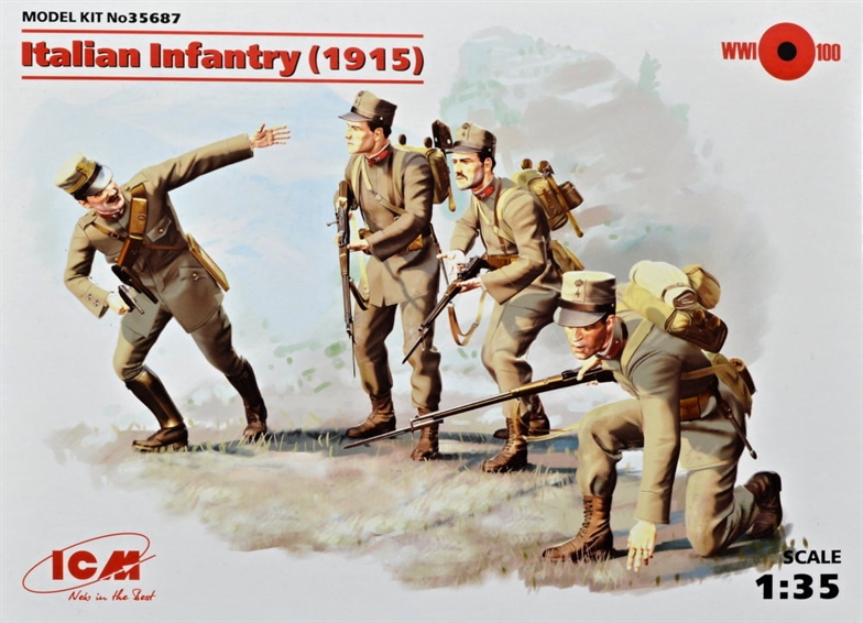 ICM - 1/35 Italian Infantry (1915) - 4 figures. The set includes a figure of the Officer and three figures of Italian infantrymen of 1915 period. Correct details of uniform. WWI Italian infantry weapons and equipment set is included