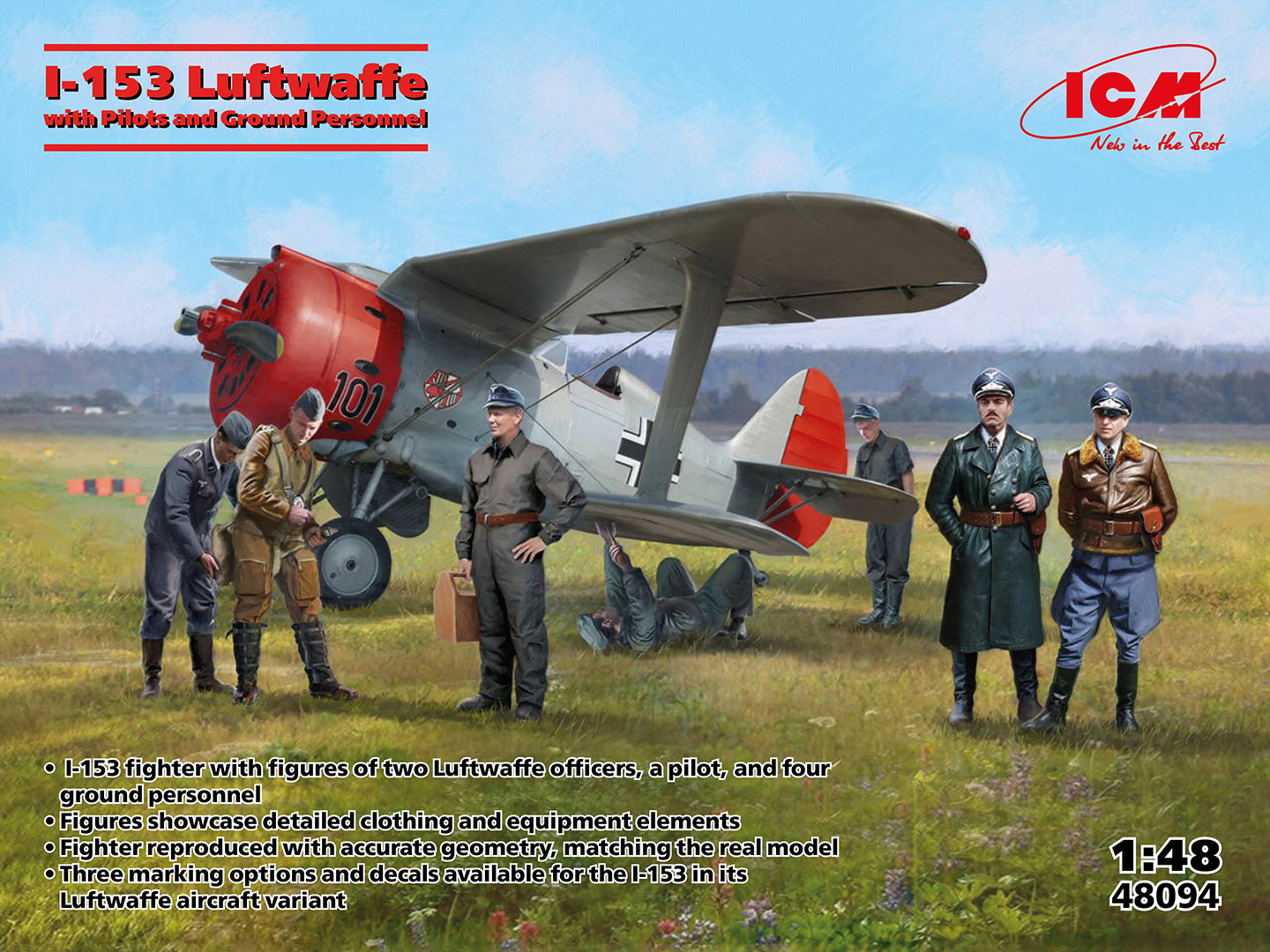 ICM - 1/48 Polikarpov I-153 with Luftwaffe Pilots and Ground Personnel new decal The Soviet I-153 biplane fighter, also known as 'Chaika,' was created in 1938 by the Polikarpov Design Bureau. It was an advancement of the I-15 fighter line, featuring retractable landing gear (unlike the fixed gear of the I-15), and was considered one of the most advanced biplane fighters of its time. A total of 3,437 of these aircraft were produced. The I-153
