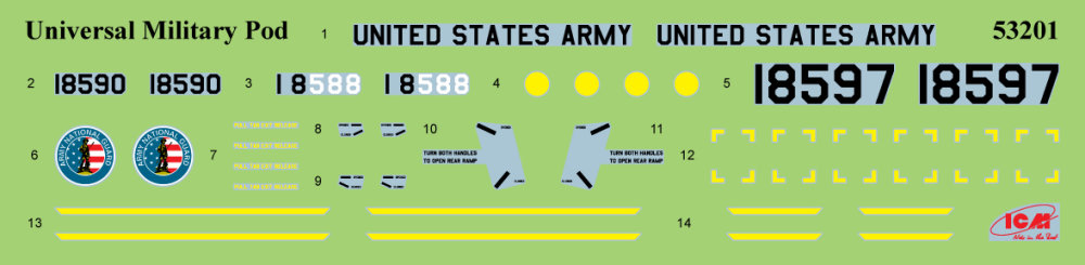 ICM - 1/35 Universal Military Pod and M8A1 landing mat The heavy-lift helicopter CH-54 Tarhe, created in 1962, was designed for transporting large military cargo. To enhance its transport capabilities, a special container was developed, which functioned as a transport capsule, allowing the transport of infantry, the wounded, or equipment. The containers were equipped with windows, doors, and a ramp at the rear, enabling the loading of military equipment, such as guns or light all-terrain vehicles. They could also be used for parachute deployment of soldiers. On the ground, if necessary, these universal containers could be towed on a trailer by military vehicles. A total of 22 containers were built, each with its own unique military registration number.