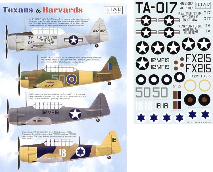 Iliad Design - 1/48 Texans and Harvards (4) North-American AT-6F 482017 TA-017 `Plan Your Future with the Aaf Enlist Now, Harvard Mk.IIb FX215/50 No 16 (Polish) Fts Raf Newton UK, North-American SNJ-4 Texan 112-MF-19 VMF-112 Hack New Caledonia 1942, Harvard Ml Iia No 18 Israeli Air Force 1950s