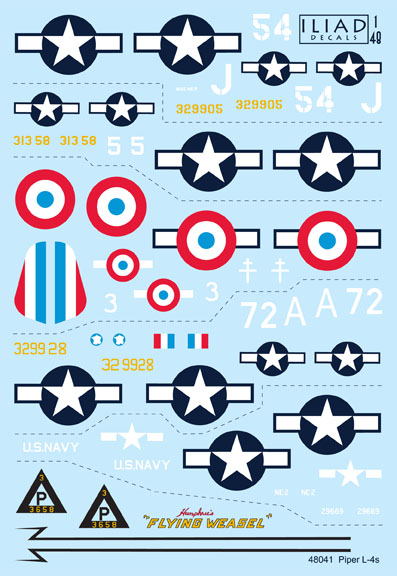 Iliad Design - 1/48 Piper L-4 Grasshopper Colourful and unusual L-4s. There are US Army, US Navy, and Free French aircraft, including one that shot down a German aircraft in a dogfight!