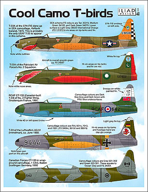 Iliad Design - 1/48 Cool Camo T-Birds. Here are some Lockheed T-33s in eye-catching schemes and very colourful markings. There's the 57th Fs 'JAWS' in Sea camouflage. There's a Pakistani bird in overall green came with a big red wing on the nose and red hi-viz markings. There's an Rcaf aircraft in post-war fighter colours of grey, green, And Pru blue, complete with a big Snoopy on a white-painted fin. There's a Luftwaffe aircraft with large nose numbers, Day-Glo hi-viz markings, and colourful unit crest on the fin. Finally there a Canadian Armed Forces bird in wrap-around camo and all-black markings. This sheet will be great for those who don't like doing natural metal finishes!