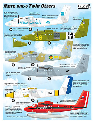 Iliad Design - 1/72 Even more colourful DHC-6 Twin Otter markings. There are aircraft of the United Nations, US Army Parachute Team in D-Dan markings, Panamanian Navy, Ethiopian Army, a special Chilean Sar scheme, and a Peruvian aircraft on floats.