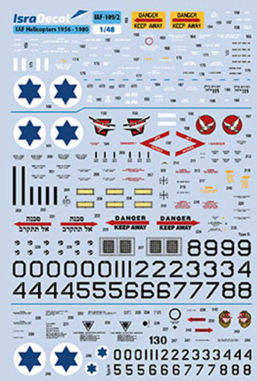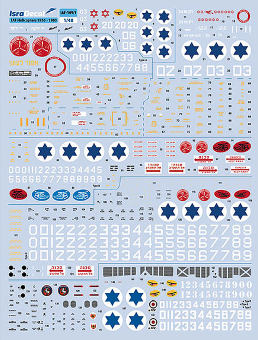 Isradecal - 1/48 Iaf Helicoperts 1955-80. For Iaf S-55, Alouette II, Bell 47, S-58/H-34, Bell 205, Bell 206, Bell 212, CH-53 and AH-1G helicopters. Instructions e-booklet available for download from www.isradecal.com/instructions