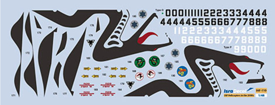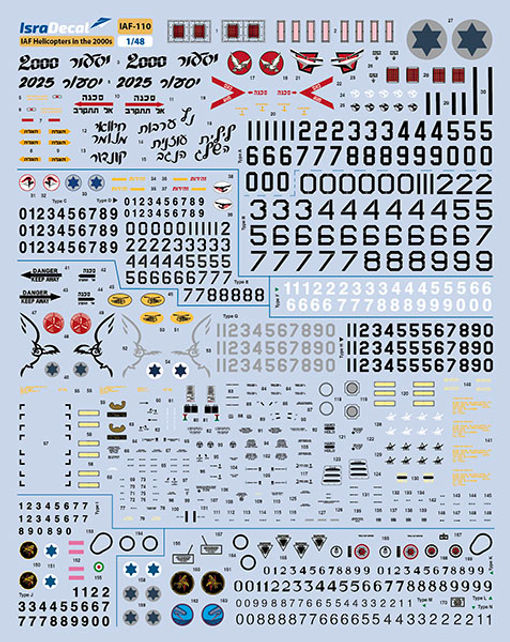 Isradecal - 1/48 Iaf Helicopers in 21st Century. For CH-53 Yas'ur 2000/2025, H-60 Black Hawk, Bell 206, AH-64A Apache, AH-64D-I Apache Longbow and AH-1F Cobra. helicopters. Instructions e-booklet available for download from www.isradecal.com/instructions