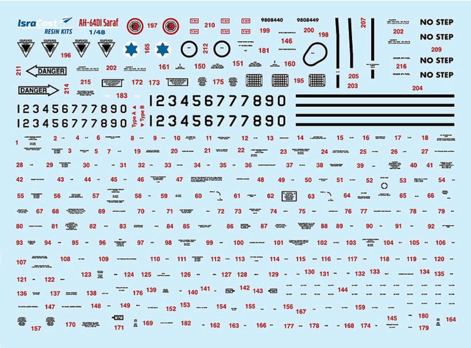 Isradecal - 1/48 Iaf AH-64DI 'Saraf' Conversion for Hasegawa AH-64D Including: 3D resin printed parts, decals and assembly instructions.