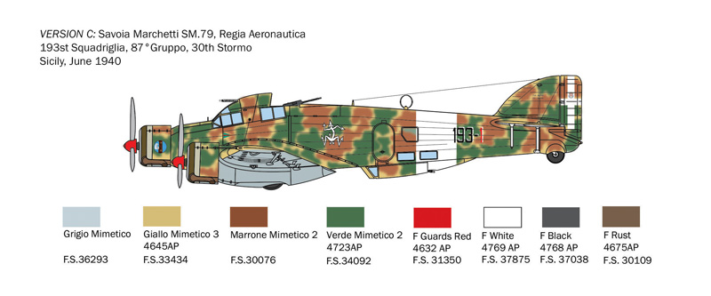 The S.M.79 Sparviero was created and manufactured in the 1930s by Italian company SIAI-Marchetti initially as a civilian aircraft, which then went on to achieve significant world speed records during this period. Featuring a typical three-engine low-wing configuration, it had a wood, canvas and metal frame. Subsequently reconfigured into military variants, it was widely used by the Italian Regia Aeronautica during the Second World War, particularly as a bomber in the Mediterranean theatre and then as an effective torpedo bomber. Recognizable by the 'hump' behind the cockpit and due to its three 750 Hp Alfa Romeo 126 RC34 radial engines, it was capable of reaching a top speed of 430 km/h. In its basic bomber role it was superseded by many other more modern aircraft, however the 'Sparviero' for the entire duration of the conflict achieved significant results in the hands of its skilled crews during torpedo maritime operations in which it attacked enemy shipping.