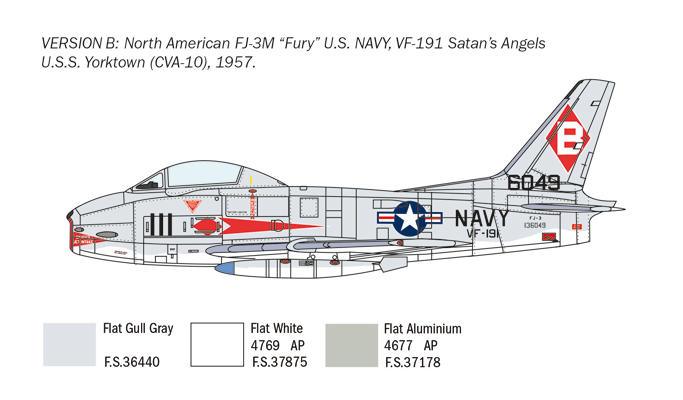 The development of the North American FJ-2 Fury was the result of a request from the United States Navy and the United States Marine Corps for the provision of a carrier-capable version of the F-86 Sabre swept-wing fighter. The carrier-capable aircraft of the period still used a straight-wing design which made them inferior to the feared Soviet swept wing Mig-15, which was extremely manoeuvrable and with a high operational capability. Production of the Fury began in 1952 with the required structural changes for take-off and landing on aircraft carriers. To maximise on-board carrier space the plane utilised folding wings, had a longer nose and reinforced landing gear. Thanks to its General Electric J47 jet engine, the Fury demonstrated good flight performance and a top speed of 1,086 km / h. It was armed with 4 Colt Mk 12 guns installed in the nose. The subsequent version, the North American FJ-3, was equipped with a new engine and provided even better operational performance.