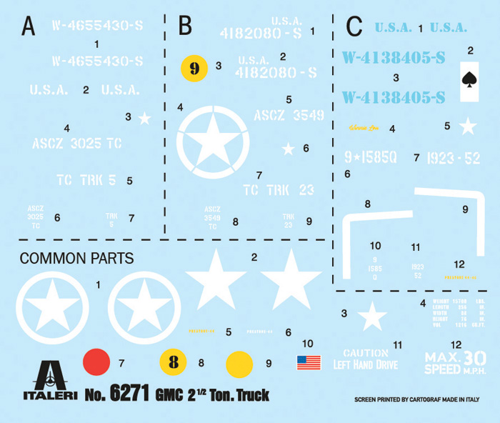 Italeri - 1/35 Gmc 2 1/2 6x6 Truck New Decals Sheet For 3 Versions Color Instruction SHEET