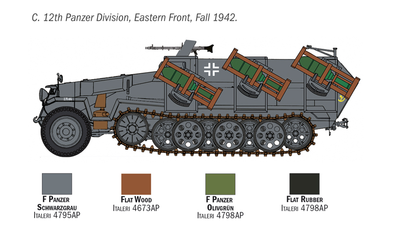 The Sd.Kfz.251 half-track was an armored fighting vehicle (AFV), which was deployed by the Wehrmacht on all operational fronts during the Second World War. Powered by a Maybach 6-cylinder petrol engine it was able to reach a speed of 55 km / h even on off road terrain. Produced in huge numbers, it was mainly used to transport Panzergrenadiers , but during the war several versions were developed to meet differing operational requirements. The Wurfrahmen rocket launcher version was built on the Sd.Kfz.251. Equipped with 6 compartments, 3 on each side, intended for the launch of rockets of different sizes, it was nicknamed Stuka zu Fuss'. Although not precise, it could have an important psychological effect on enemy troops and still proved to be a valid support for ground troops especially in urban fighting.