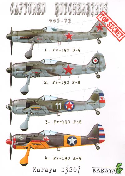 Karaya - 1/32 Captured Butcherbirds Part 6 (4) Focke-Wulf Fw-190D-9 captured by Soviets in Marienburg 1945 Luftwaffe camouflage with red stars, Fw-190F-8 served with Kommando-Seydlitz unit of German Communists 1945 in Luftaffe camouflage with red stars on fuselage and top wings, red crosses underwing and Raf roundel on fin, Fw-190F-8 White 11 ex 1./SG2 captured by Yugoslavian partisans Luftwaffe camouflage with red stars in blue circles, Fw-190A-5 65thFS/ 57th Fg Luftwaffe upper camo, yellow undersurface and trim, U.S. stars