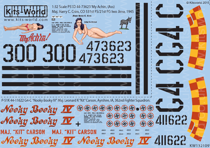 Kits-World - 1/32 North-American P-51D 44-73623 'My Achin, (Ass) Maj. Harry C. Crim, CO 531st FS/21st FG Iwo Jima, 1945. P-51K 44-11622 G4-C "Nooky Booky IV" Maj. Leonard K "Kit" Carson, Ayrshire, IA, 362nd Fighter Squadron.
