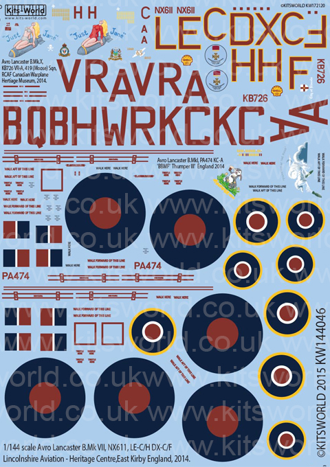 Kits-World - 1/144 Avro Lancaster B.Mk VII, NX611, LE-C/H DX-C/F Lincolnshire Aviation Heritage Centre,East Kirby England, 2014. Avro Lancaster B.Mk.X, KB726 VR-A, 419 (Moose) Sqn, RCAF Canadian Warplane Hertiage Museum, 2014. Avro Lancaster B.MkI, PA474 KC-A 'BBMF DV385 Thumper III' England 2014.