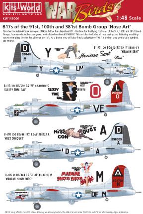 Kits-World - 1/48 Boeing B-17G Flying Fortress Nose Art of the 91st, 100th and 381st Bg (4) LN-Y 100th Bg Heaven Sent , VE-O 381st Bg Sleepy Time Gal , LD-A 10th Bg Miss Conduct , DF-M 91st Bg Madame Shoo Shoo , Individual aircraft markings only, all overall natural metal.