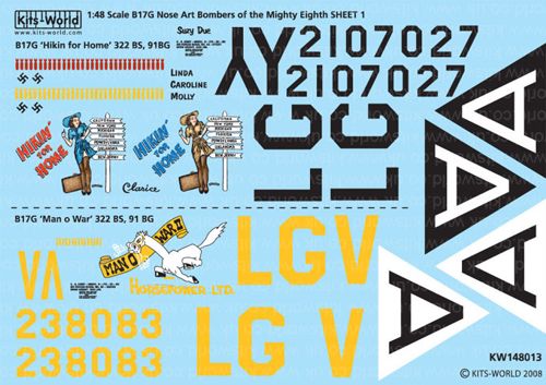 Kits-World - 1/48 Boeing B-17G Flying Fortress 91st Bg 8th Air Force Nose Art (2) LG-Y 322nd Bs Hikin for Home overall natural metal, LG-V 322nd Bs Man O War OD/grey.. Individual aircraft markings only.
