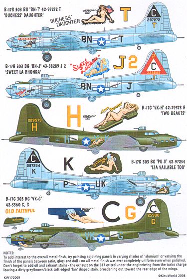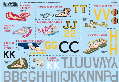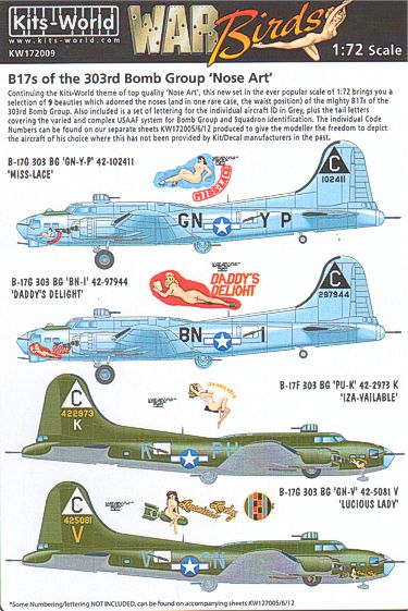 Kits-World - 1/72 Boeing B-17F/B-17G Flying Fortress 303rd Bg Nose Art (9) GN-YP/C 'Miss Lace': BN-I/C 'Daddy's Delight', PU-K/C 'Iza-Vailable' GN-V/C 'Lucious Lady', BN-T/C 'Duchess' Daughter', BN-J/C 'Sweet La Rhonda', VK-H 'Two Beauts', PU-K/C 'Iza Vailable Too', VK-G/C 'Old Faithful'. Individual aircraft markings