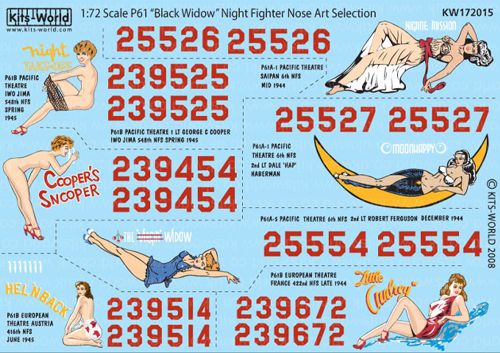 Kits-World - 1/72 Northrop P-61A/P-61B 'Black Widow' (7) 25526 'Nightie Mission' 6th NFS, 25527 'Moonhappy' 6th NFS, 239514 'Hel'n Back' 416th NFS, 239572 'Little Audrey' 422nd, 239525 'Night Take Off' 548th NFS, 239454 'Cooper's Snooper', 25554 'The Virgin Widow' 6th NFS. Individual aircraft markings only.------(Northrop P-61A/Northrop P-61B)