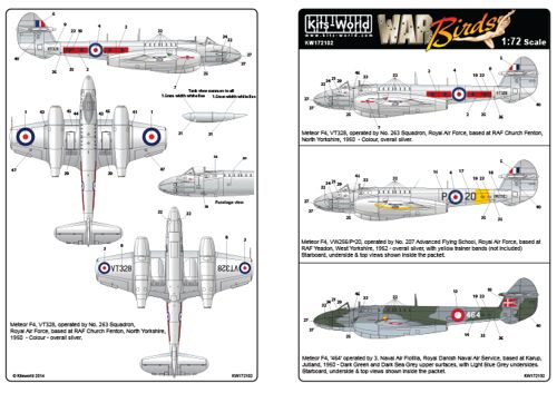 Kits-World - 1/72 Scale Gloster Meteor F.4, VT328, operated by No. 263 Squadron, Royal Air Force, based at Raf Church Fenton, North Yorkshire, 1950 overall silver.