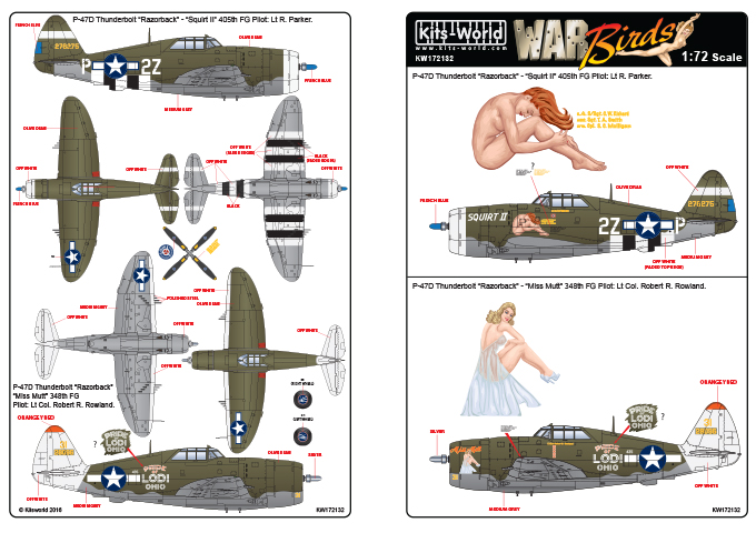 Kits-World - 1/72 Republic P-47D Thunderbolt "Razorback" 42-76275 - "Squirt II" 405th FG. Pilot: Lt R. Parker P-47D Thunderbolt "Razorback" 42-8096 - "Miss Mutt" 348th FG. Pilot: Lt Col. Robert R. Rowland.