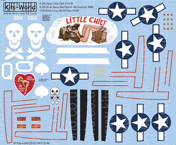 Kits-World - 1/72 Douglas A-20 Havocs A-20G, Havoc 'Little Chief' 321st BS - A-20G-DL-40, Havoc 'Miss Possum My Texas Gal', 388BS, 312th Bomb Group, 5th Air Force, USAAF.