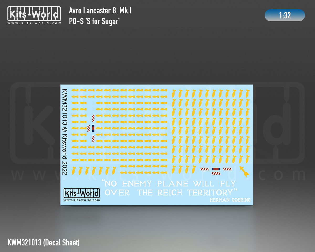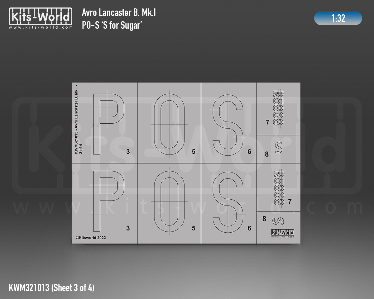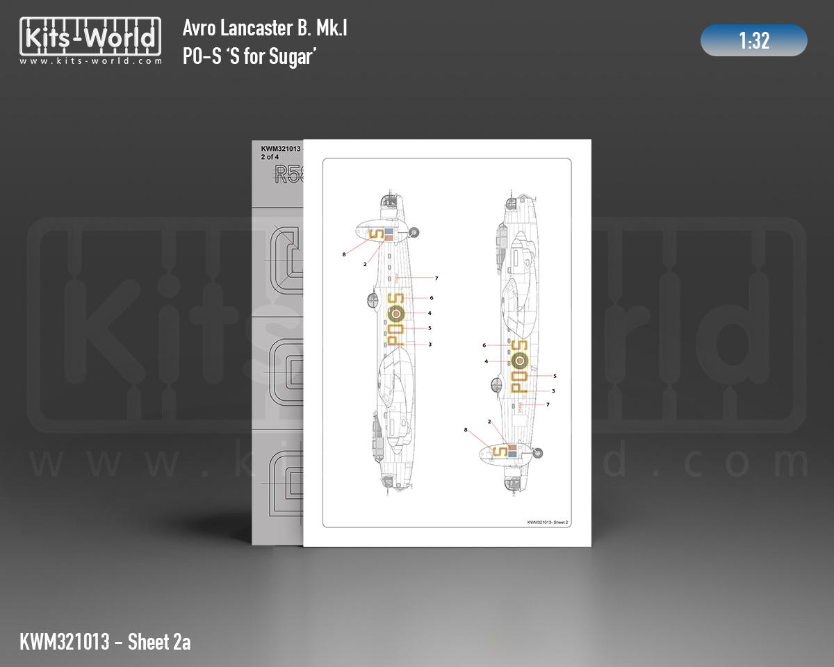 Kits-World - 1/32 Avro Lancaster B.I/III PO-S, S for Sugar, R5868 5 sheet stencil scheme set including the decal sheet.