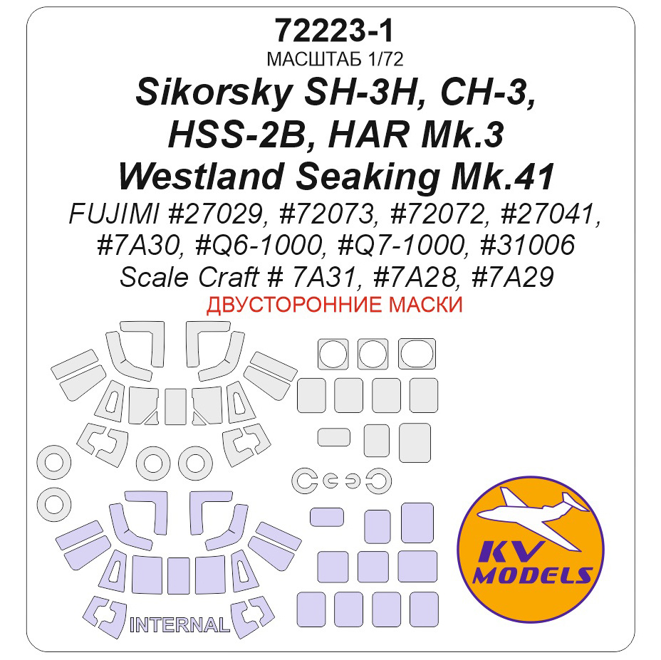 KV Decals - 1/72 Sikorsky SH-3H, CH-3, HSS-2B, Har Mk.3 / Westland Seaking Mk.41 for Fujimi Part27029, Part72073, Part72072, Part27041, Part7A30, PartQ6-1000, PartQ7-1000, Part31006 / Scale Craft Part 7A31, Part7A28, Part7A29 wheels and canopy frame paint mask inside and outside